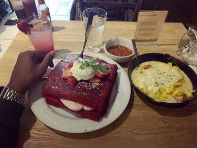Red Velvet pancakes, Creole Shrimp & grits, & berry lemonade. This is one of the best breakfast spots in Philadelphia. Now them red velvet pancakes is more than enough for 2 people, you will get 3 big pancakes. The shrimp & grits come with a creole sauce that is soooo good.