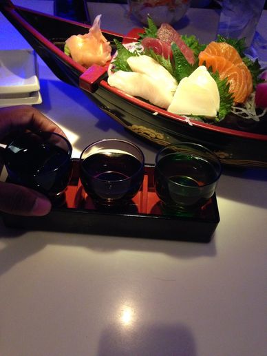 Sashimi boat and warm sake. Undoubtedly one of my favorite sushi places. Very fresh sushi at a reasonable price not to mention the presentation of it all. My favorite is the Volcano roll ! The ambiance is very nice here too, they have an all white setting with blue light strips throughout the restaurant.